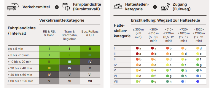 ÖPNV-Güteklassen ermöglichen eine integrierte Bewertung der ÖPNV-Anbindung von Gebieten: Aus Informationen zum bedienenden Verkehrsmittel und zur Fahrplandichte (Takt/Abfahrten) werden Haltestellenkategorien (I-VII) abgeleitet. In Kombination mit der Entfernung von der jeweiligen Haltestelle ergeben sich daraus ÖPNV-Güteklassen (in abfallender Güte von A bis I).