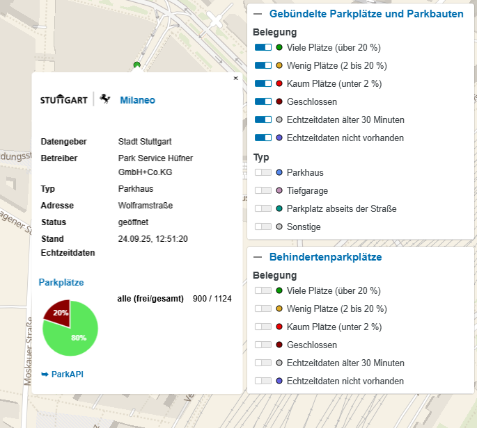 Der Datensatz Gebündelte Daten Straßen-Parkplätze Baden-Württemberg bündelt landesweit Standortinformationen und, wenn vorhanden, Echtzeit-Belegungsdaten zu Parkmöglichkeiten im öffentlichen Straßenraum in Baden-Württemberg. Dies umfasst nicht bewirtschafteten Parkraum am Fahrbahnrand sowie bewirtschaftete und ggf. geordnete Parkstände am Fahrbahnrand oder im Seitenraum. Sonderparkplätze wie Behindertenparkplätze, Carsharing-Stellplätze, Familienparkplätze oder Plätze mit Lademöglichkeit gehören ebenfalls dazu.