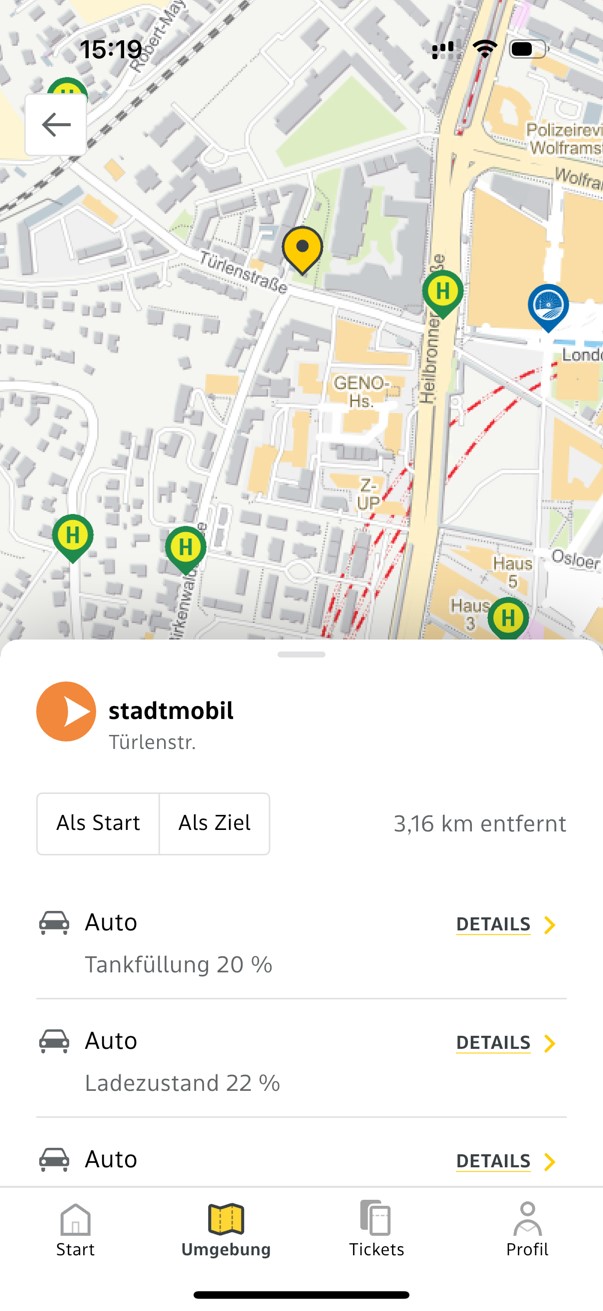 Neuerdings werden Sharingangebot für Autos, E-Scooter und Fahrräder in immer mehr ÖPNV-Apps angezeigt. Die landesweite App der bwegt-Fahrplanauskunft und die neue VVS-App integrieren die Standorte von Sharingangeboten auf ihren Umgebungskarten. So findet sich bei der Ankunft mit Bus oder Bahn direkt ein Sharingfahrzeug, etwa für die letzte Meile zum Ziel.