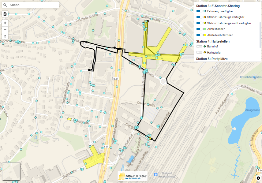 Über den landesweit gebündelten Datensatz E-Scooter-Sharing werden anonymisierte Live-Daten zu Standorten, Batteriestand und Verfügbarkeit von E-Scootern verschiedener Anbieter bereitgestellt. Diese Daten erlauben eine anbieterunabhängige Übersicht darüber, wie E-Scooter im städtischen Raum verteilt sind und genutzt werden. Damit und mithilfe von Rückmeldungen aus der Bürgerschaft definiert das Team Mikromobilität der Landeshauptstadt Stuttgart vor allem in der Innenstadt einerseits ein Netz an ausgewiesenen Abstellzonen und andererseits größere Geofencingzonen, in denen die E-Scooter nicht abgestellt werden dürfen. So lässt sich die multimodale und flexible Mobilität fördern und gleichzeitig konfliktarm im Stadtraum integrieren.