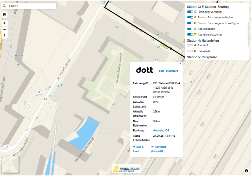 Auch die Daten zur Verfügbarkeit und zu Standorten von E-Scootern werden nicht direkt von der Stadt erhoben, sondern stammen von privaten Anbietern. Dennoch sind sie wichtig für die Analyse urbaner Mobilität und die Planung nachhaltiger Angebote im öffentlichen Raum. Diese Informationen lassen sich auch z.B. in ÖPNV-Auskunfts-Apps intergrieren. So kann etwa die VVS-App zeigen, ob an der Ziel-Haltestelle ein E-Scooter bereitsteht, um die letzten Meter bis nach Hause oder zum Termin zurückzulegen. Die Rolle von Datenplattformen zur Bündelung dieser Informationen und die Nutzung der Daten durch die Stadtverwaltung stehen im Fokus dieser Station.
